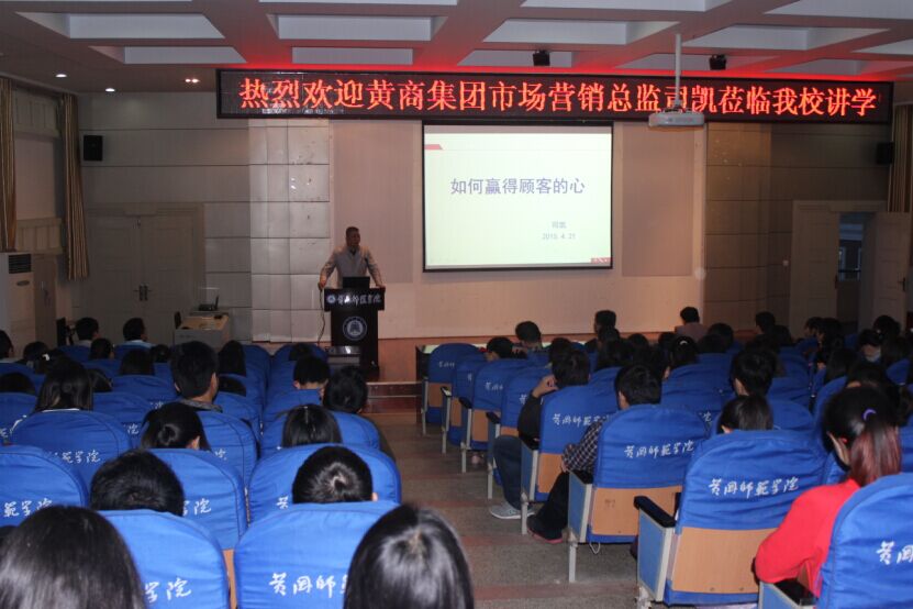 为有序推进扎实落实我院转型工作,我院“企业家进课堂”活动月,4月21日晚上7点在教学楼B03报告厅,黄商集团副总、市场营销总监司凯先生结合市场营销专业转型为william威廉中文官网学生作了题为“如何赢得顾客的心”的营销专题讲座。