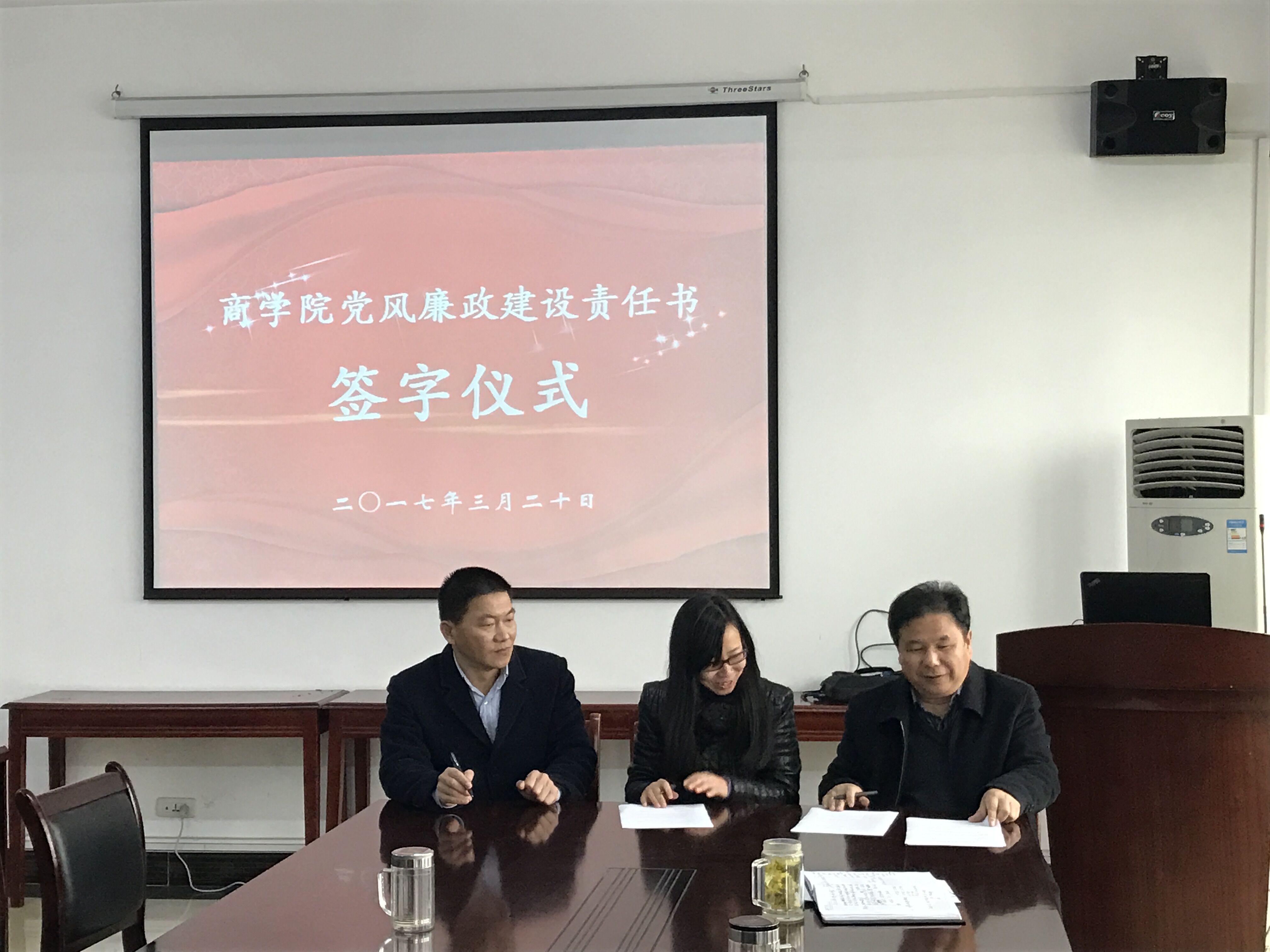 3月20日上午9点,在我院党政班子每周例会之前,学院全体班子成员在学院704#会议室举行了每年一度的学院党风廉政建设责任书签字仪式。仪式由学院党总支书记李月华主持。
