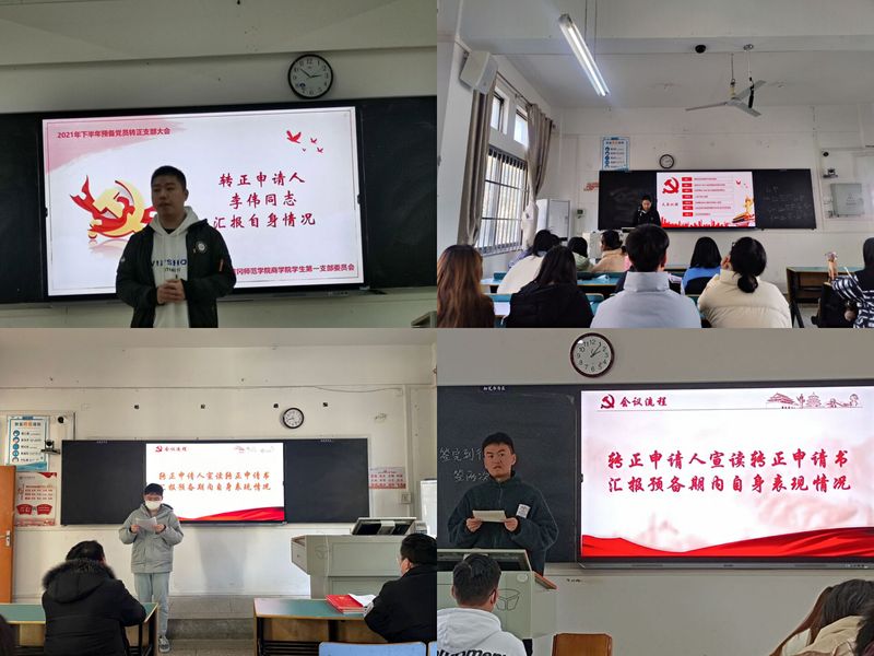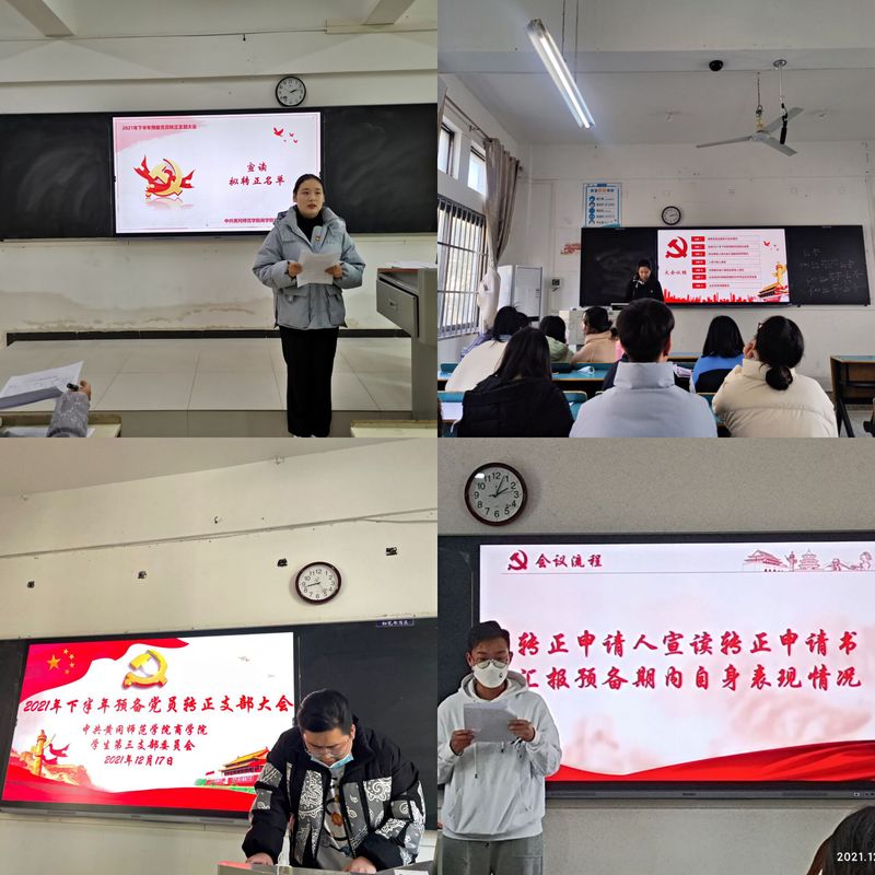 2021年12月17日下午,william威廉中文官网学生各党支部分别于创新楼102教室、力行楼202教室、力行楼204教室、力行楼302教室召开预备党员转正支部大会。大会由学生各支部副书记主持,各支部全体党员参会。