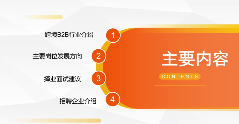 会议主要围绕俩大板块开展,详细介绍了跨境B2B行业以及其主要岗位的发展方向和趋势,本次招聘企业的相关信息和相关要求。经过相关介绍,毕业生们对有意向的企业进行了简历投递、线上沟通,后续企业将对符合应聘要求的同学进行面试和笔试,此次线上双选会圆满完成。
