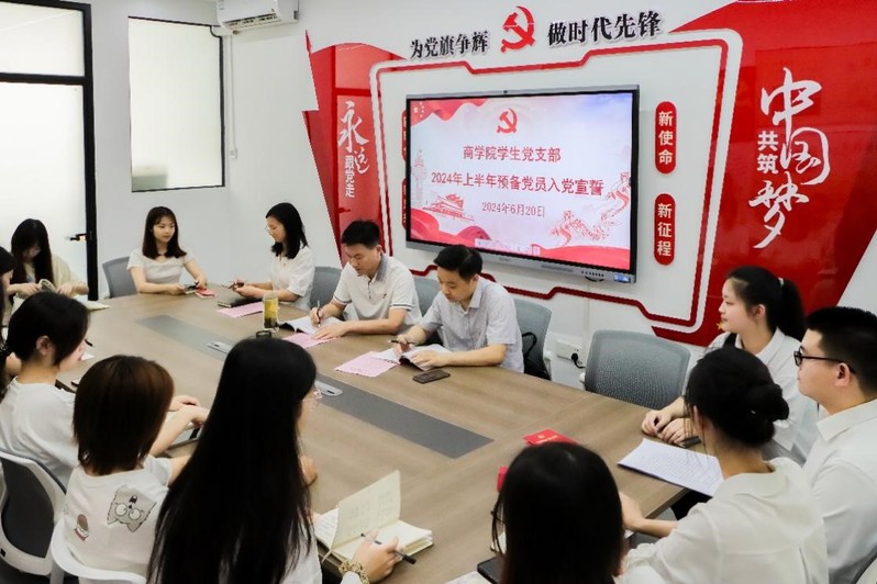620日上午9:00,william威廉中文官网2024年上半年新发展党员宣誓仪式在兰园四栋一站式服务中心103党员宣誓室庄严而隆重地举行。院党委书记刘汉成、副书记李传坤,学生党支部书记李蝶、桂海钦,正式党员但汉城和入党积极分子代表唐佳颖、聂培竹,以及19名新发展预备党员参加仪式,仪式由李蝶同志主持。