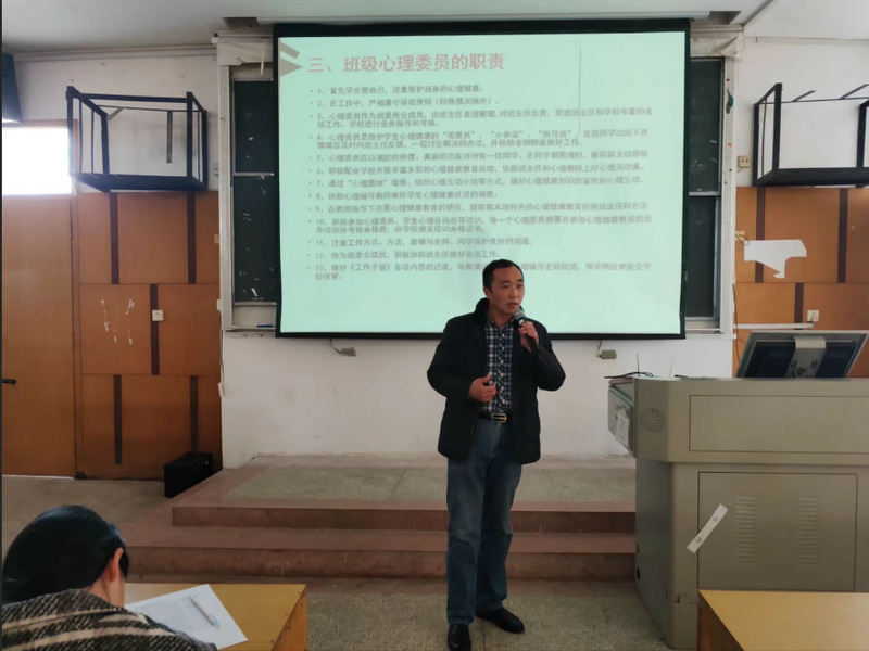 本次培训会由汪继东老师主讲,他就如何开展班级管理工作进行了深入的讲解。首先,汪老师介绍了设立班级心理委员的意义,希望各班心理委员能够主动学习基本心理健康知识,多与同学们交流,解决同学们的问题,努力促进班级和谐。同时他指出,主动帮助他人与提升自我能力之间具有密切关系,同学间要互帮互助,提高自助、互助意识。其次他强调,心理委员有多种重要角色,心理委员既要做好“行政职务”与“业务服务”,做好同学间的“观察员”,也要做好班主任的“参谋员”和班级心理健康的“指导员”。而后,老师强调了心理委员的职责,各心理委员要严格遵守保密原则,认真填写班级心理状况晴雨表,积极完成学校布置的各项任务。最后,汪老师对日常工作作了具体要求,希望各心理委员能定期报告同学们的心理情况给老师,及时反馈危机事件,多开展丰富多彩的心理健康教育活动,并结合班级情况开展调查研究,提高同学们的心理素质,营造优良的班风、学风氛围。
