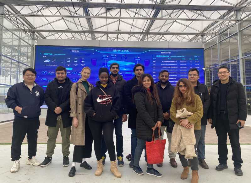 叶路洲自然条件独特、交通便利,一直是武汉都市圈的“后花园”,“菜篮子”。现代蔬菜种植示范园位于四面环水的叶路洲上。行驶在大堤上,远远就能看见一排排钢构蔬菜大棚错落有致、整齐划一、连绵不断。走进示范园的玻璃连栋温室展示区,首先映入眼帘的是一块巨大的电子屏幕,上面动态显示着园区的天气情况、园区建设情况,农作物数量、棚内的空气温度、湿度、光照强度以及各类蔬菜水果的收购价格等详细数据。在工作人员的带领下,我院外籍师生认真听取了园区位置、建设情况、农作物生产情况的介绍。