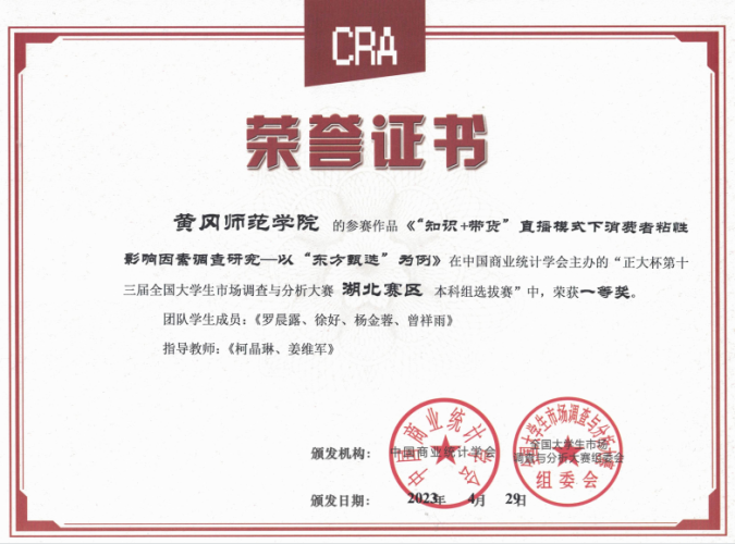 3 | “知识+带货”直播模式下消费者粘性影响因素调查研究—以“东方甄选”为例 | 柯晶琳、姜维军 | 罗晨露、徐好、杨金蓉、曾祥雨 | 湖北省一等奖 |