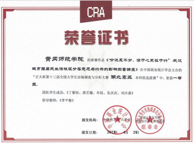 1 | 分还是不分,源于心更在于行”-武汉城市圈居民生活垃圾分类意愿与行为的影响因素调查 | 李平衡 | 丁紫怡、唐芷璇、牟杭、朱庆庆、刘卉惠 | 湖北省一等奖 |
