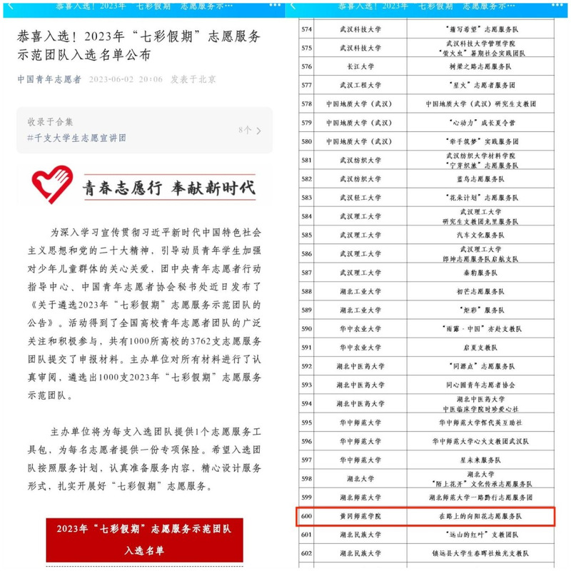 六月捷报!孟夏之日,万物并秀,一路向阳。在我院党委和校团委的正确领导和悉心关怀下,我院团委“在路上的向阳花”社会实践志愿服务队在1000所高校、3762支队伍中脱颖而出,成功被团中央青年志愿者行动指导中心、中国青年志愿者协会评为2023年“七彩假期”志愿服务示范团队。