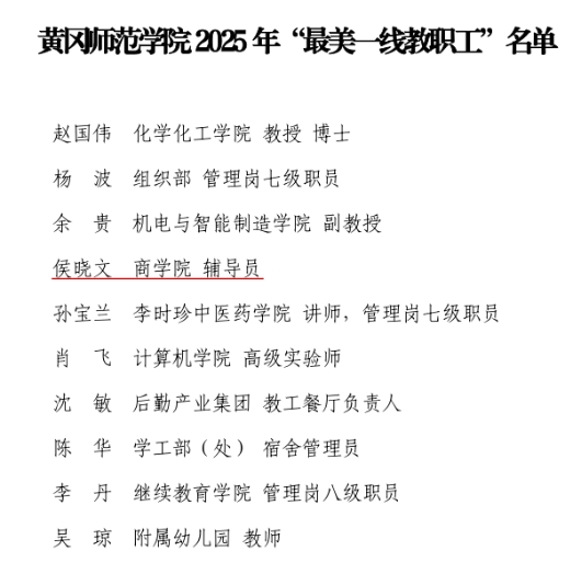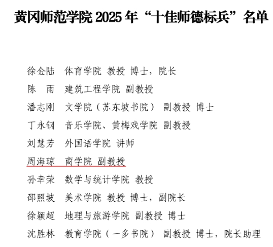 近日,学校公布了黄冈师范学院2025年“十佳师德标兵”“明珠巾英”“最美一线教职工”表彰名单。 我院周海琼、侯晓文两名教职工分别获2025年“十佳师德标兵”和2025年“最美一线教职工”荣誉称号。